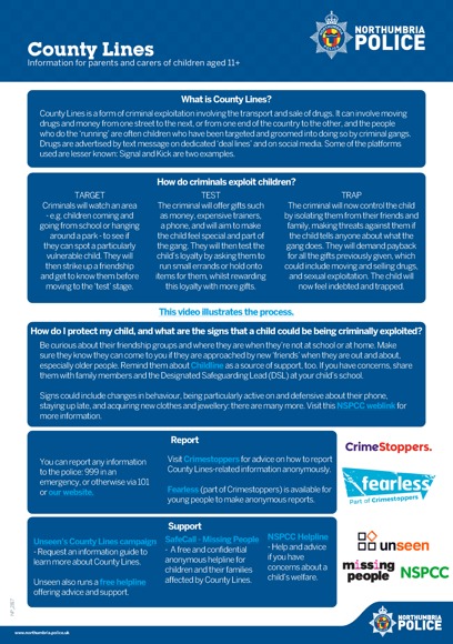 Please see the below poster from Northumbria Police on county lines and information for parents/carers around the dangers and signs.