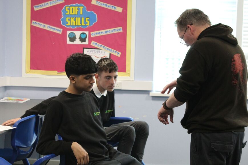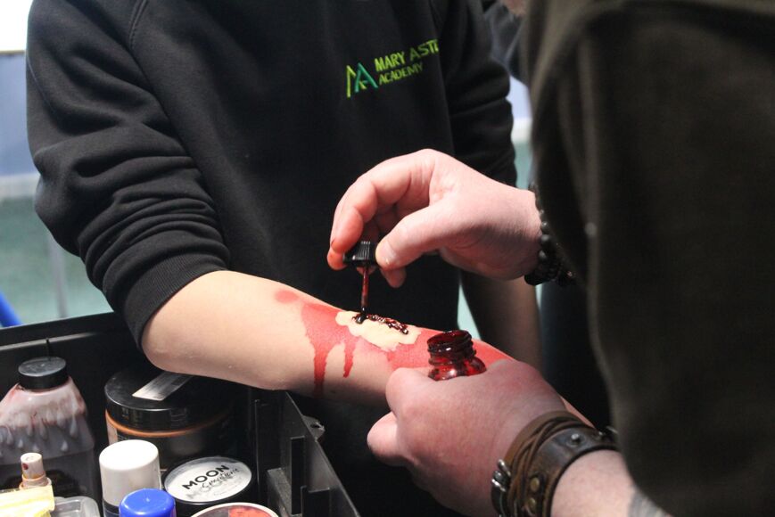 The students took part in a discussion around special effects makeup and spoke with artist Wayne Thompson about the work he has done within the industry. Wayne showed the students an example of some of the special effects work he does, the students also took a patch test to allow them to experiment with the makeup in the next workshop. The students engaged well with the workshops and enjoyed seeing the practical props.