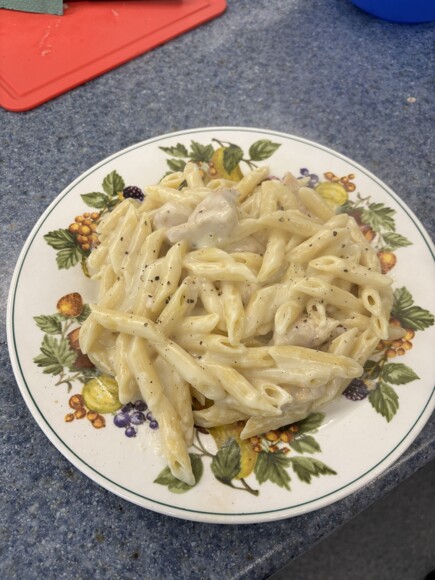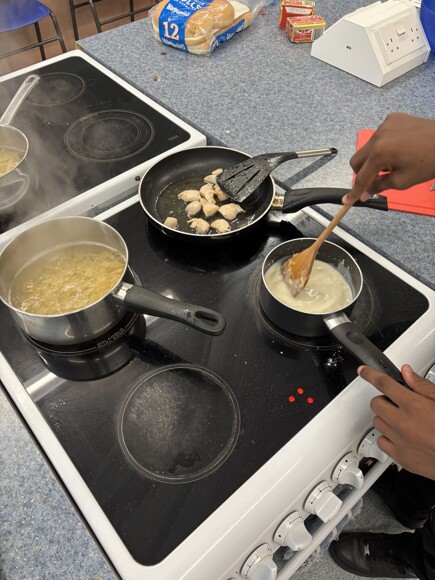One of the key skills they learnt was how to make a basic roux, which is the starting point for lots of sauces. By mixing flour and butter, then slowly adding milk, they created a smooth béchamel sauce. With a bit of cheese and cooked chicken added in, this turned into a delicious pasta dish made completely from scratch.