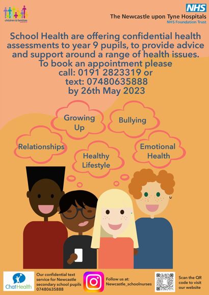 As part of our Universal School Health offer, we would like to offer all Year 9 pupils an optional confidential face to face health assessment. This will give pupils the opportunity to discuss any concerns they may have around their health and well-being with a member of the school health team.